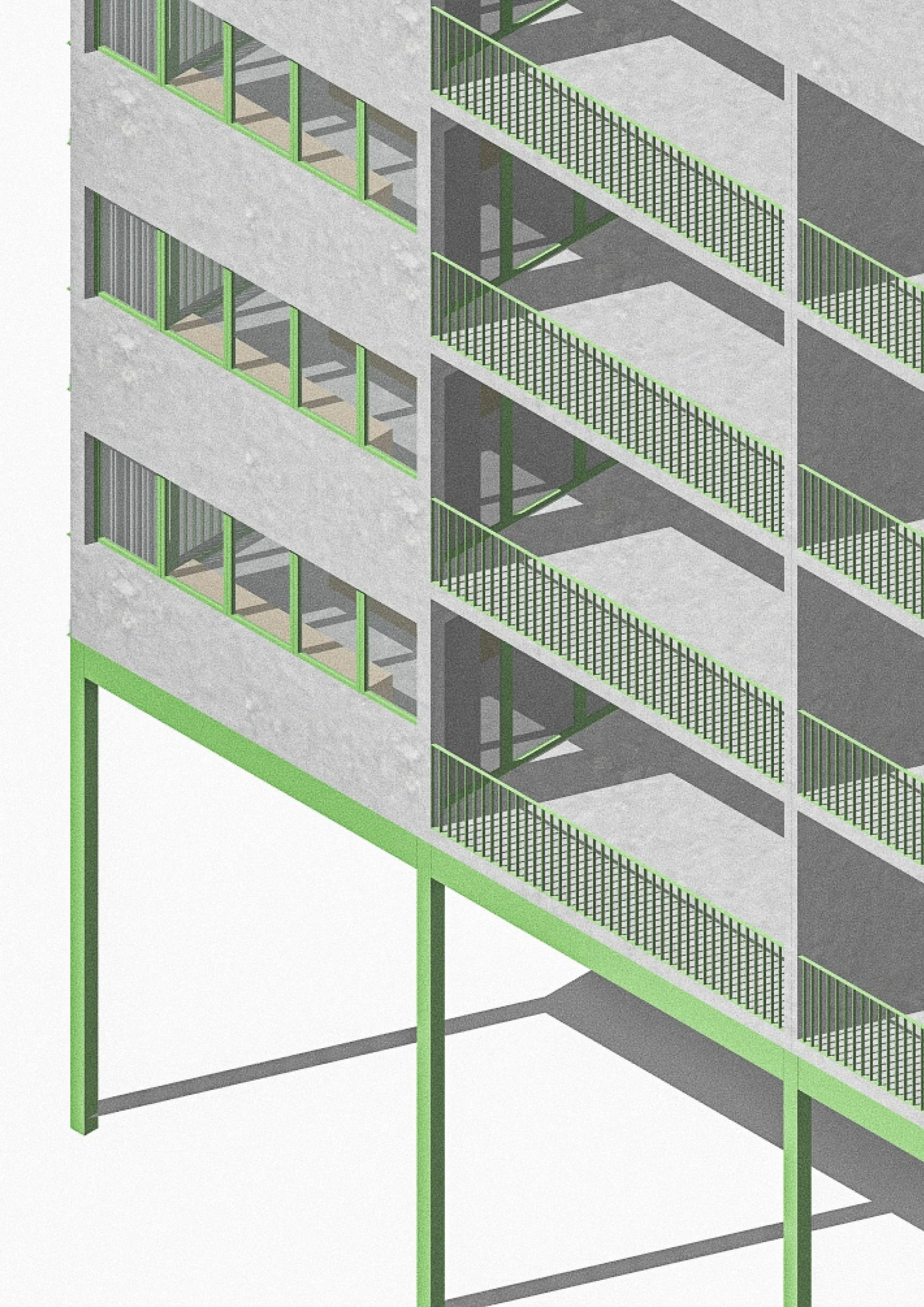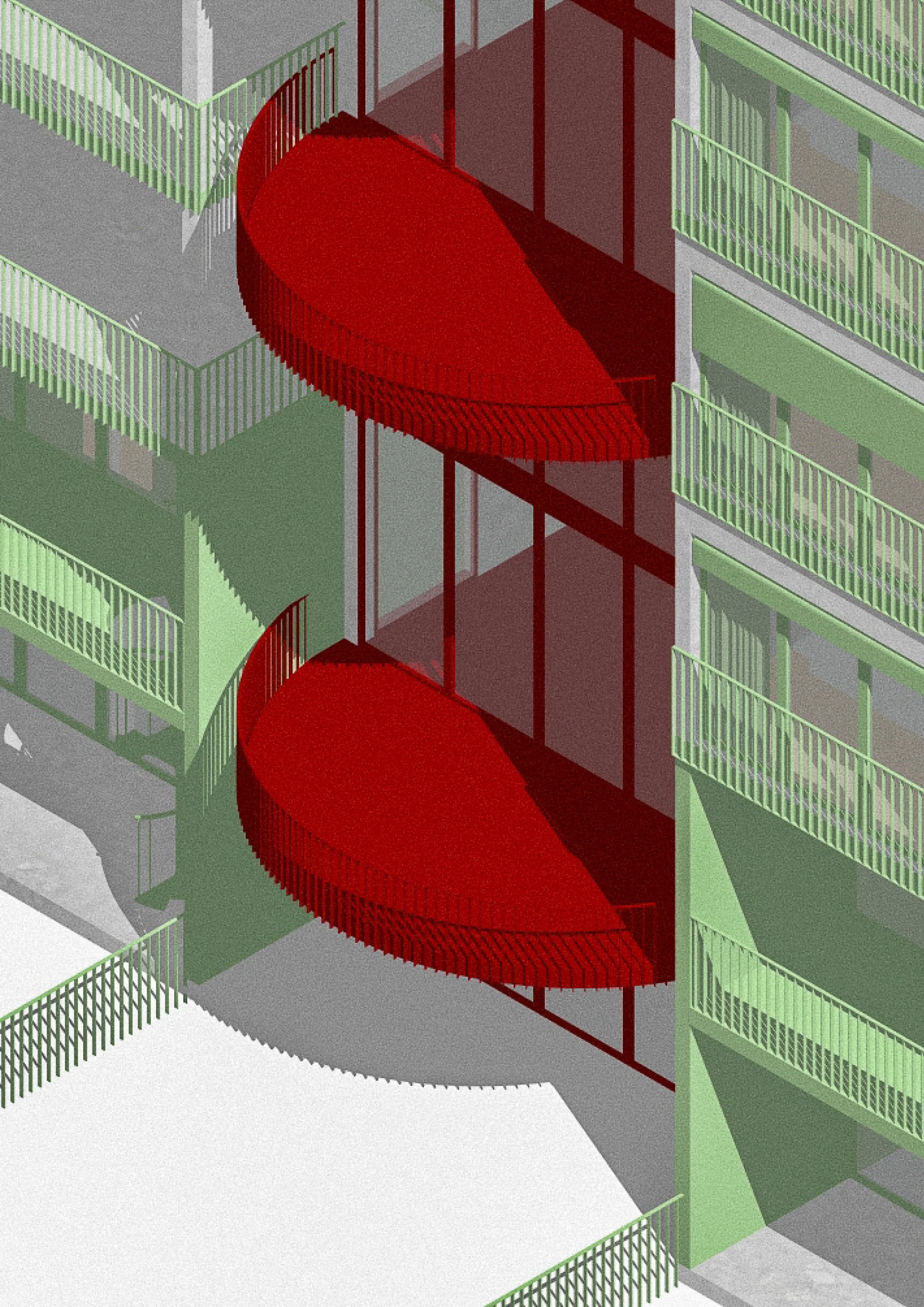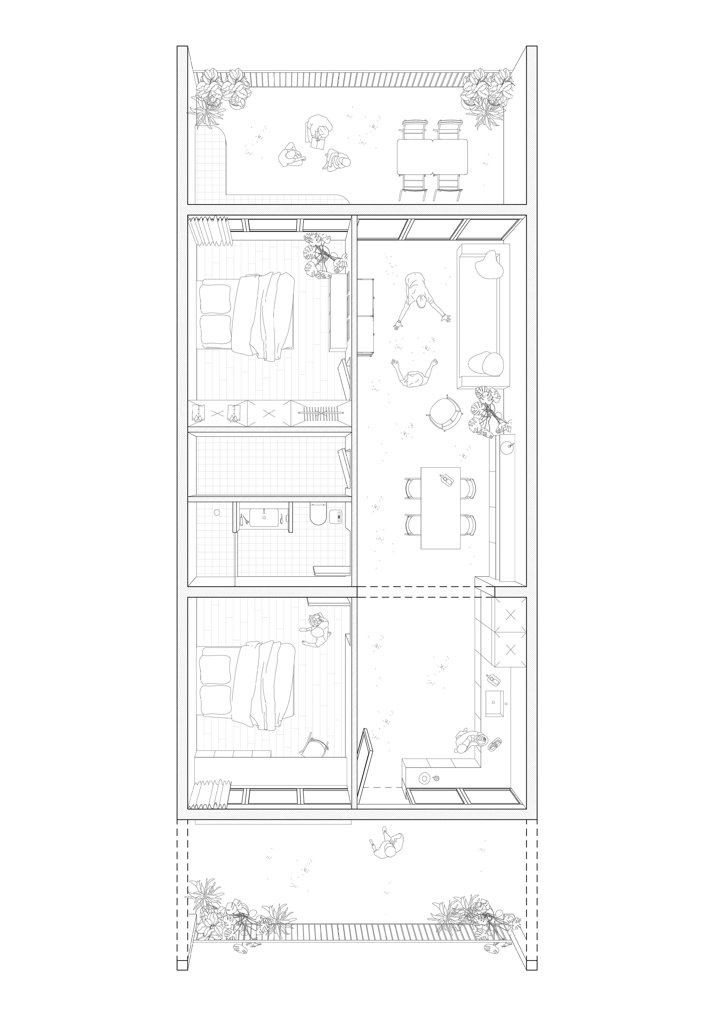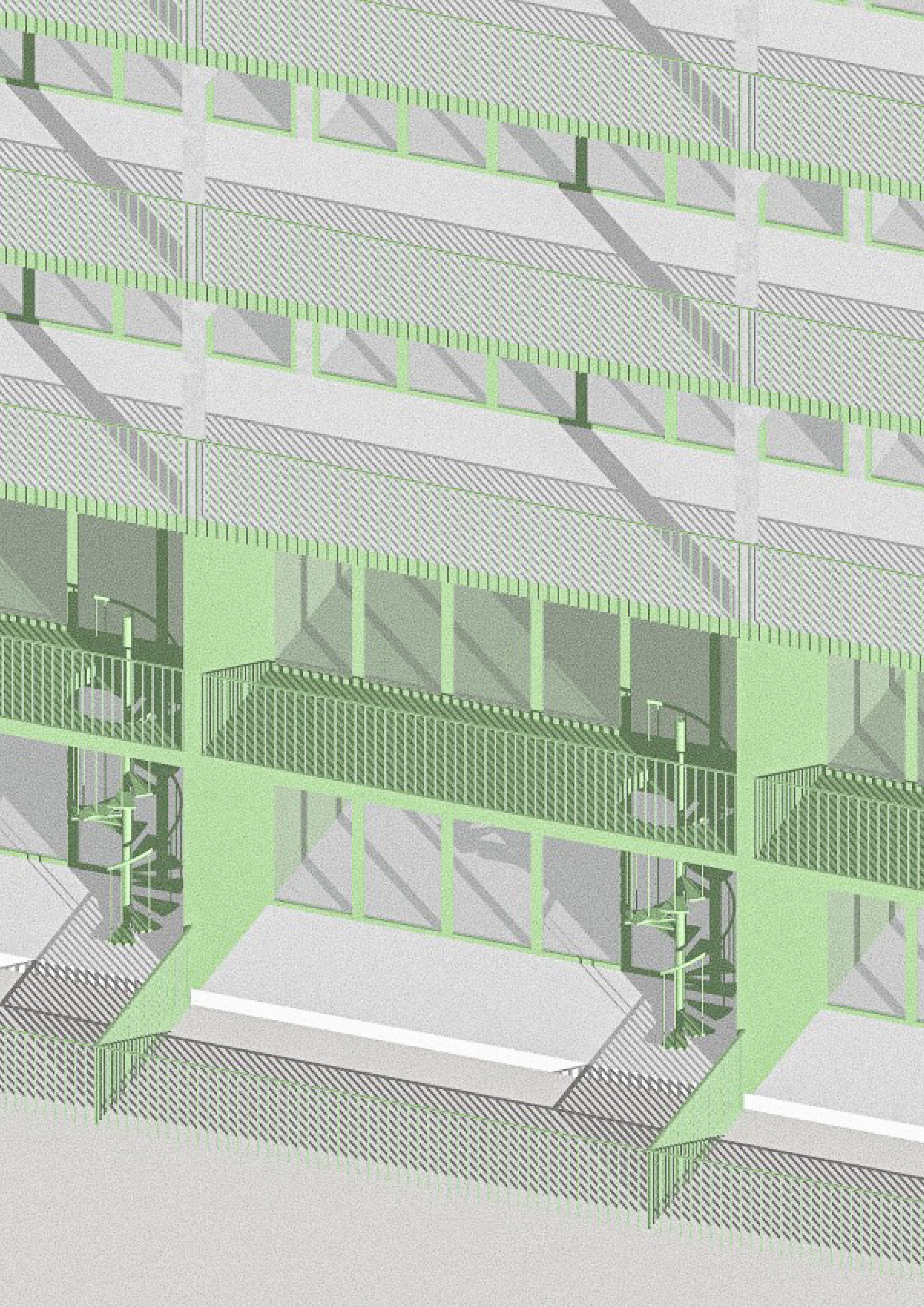 En s’appuyant sur la structure existante, l’intervention introduit de nouvelles typologies d’habitat : logements traversants, maisons urbaines, co-living, espaces partagés. Les circulations deviennent des lieux habités, des prolongements extérieurs des logements. Le socle (café, commerces, gym, crèche) ancre le projet dans les pratiques collectives du quotidien.