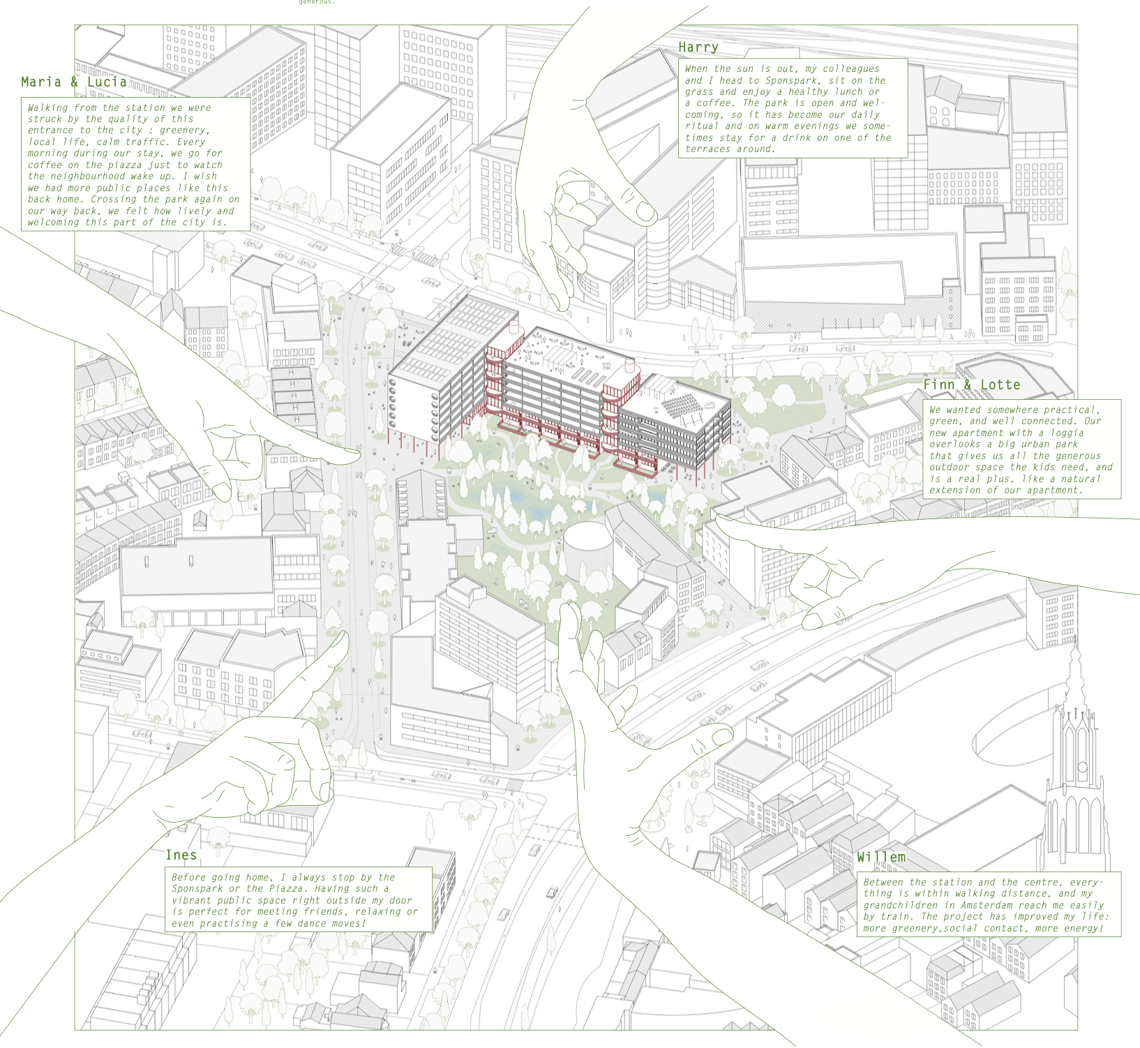 À l’échelle du quotidien, la transformation de l’Otto Scheltusflat est pensée comme un milieu habité : un lieu que l’on traverse, que l’on s’approprie, où l’on se rencontre. Le projet assume cette position d’entre-deux, pour en faire un support d’usages.