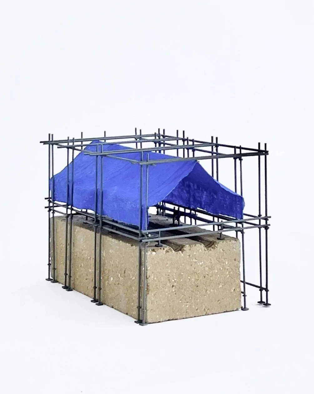 L’installation repose sur une structure autoportante en échafaudage, constituée exclusivement d’éléments issus du réemploi. Aucune coupe, aucune fixation définitive : l’assemblage s’effectue par emboîtement des pièces, sans recours à des consommables ou à des fixations invasives.