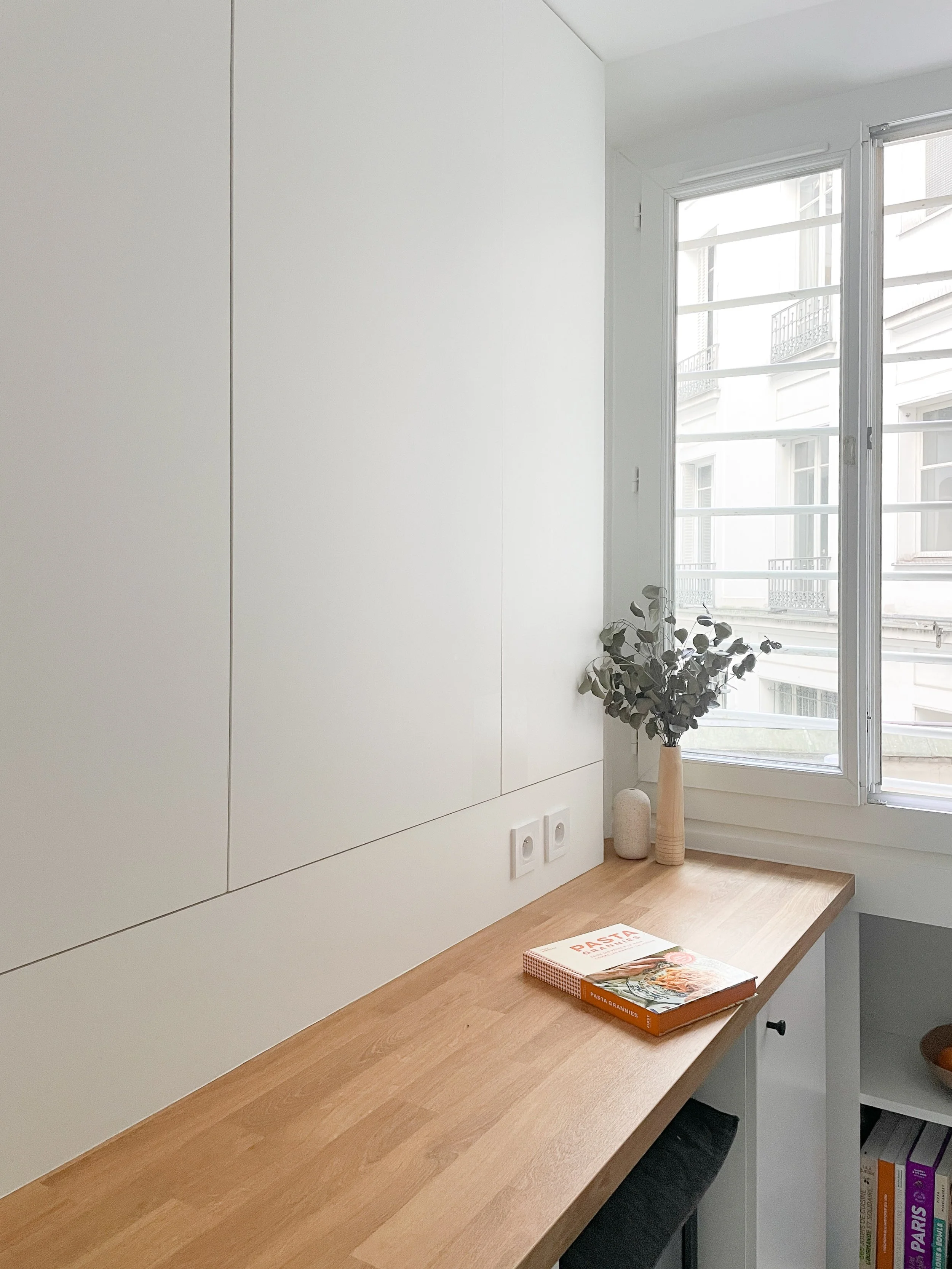 Cette petite cuisine de 6 m² a fait l’objet d’une transformation complète, avec l’intégration d’un grand mur de rangements sur mesure. L’espace de travail a été largement optimisé, offrant désormais une généreuse surface de plan de travail. Le projet s’inscrit dans une démarche d’économie de moyens, en valorisant des choix simples, fonctionnels et durables.